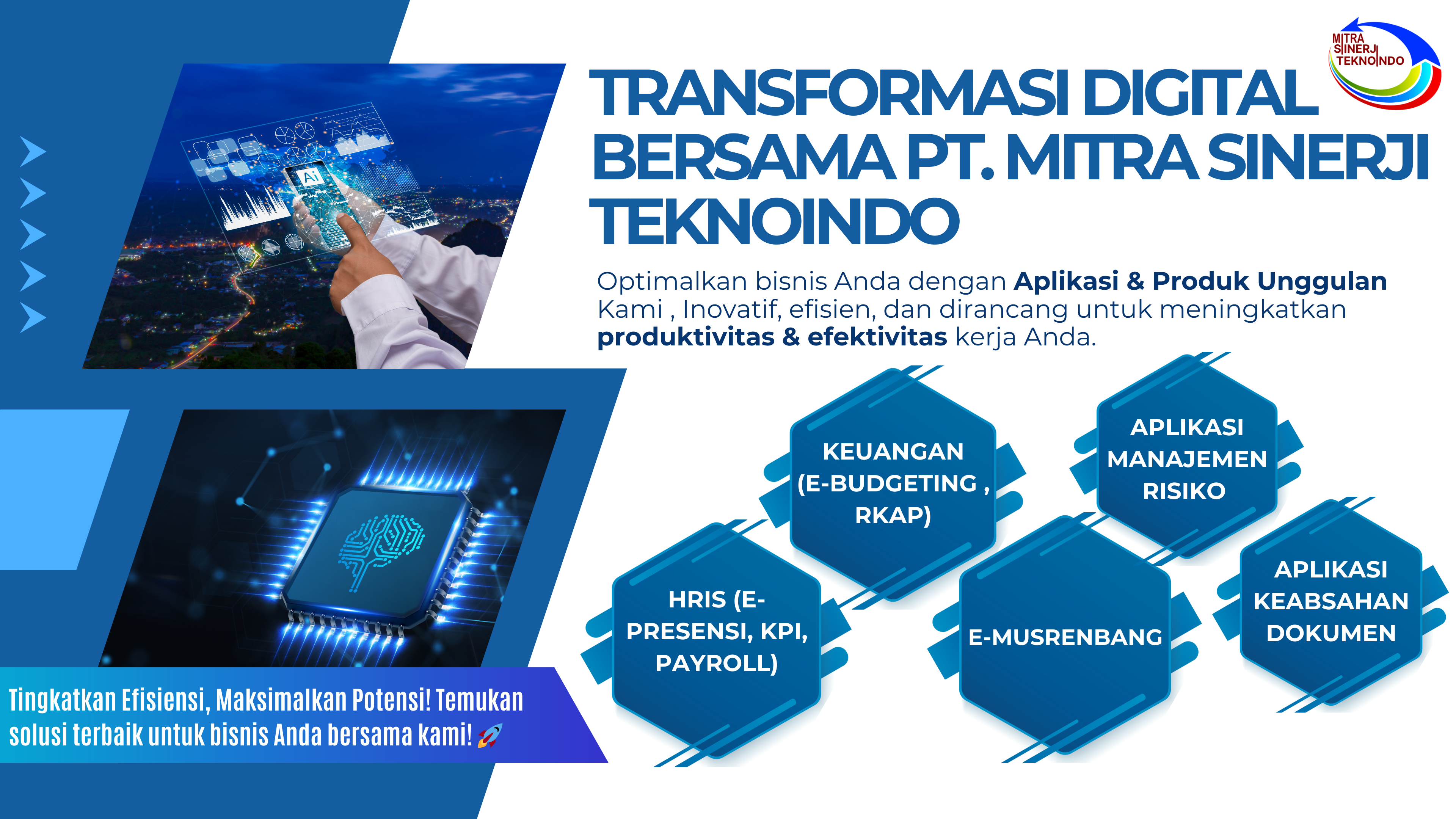 Di PT Mitra Sinerji Teknoindo, kami memahami bahwa semua bisnis memiliki keunikan masing-masing. Karena itu kami melakukan pendekatan ke arah kustomisasi, memastikan bahwa setiap solusi yang ditawarkan dapat diaplikasikan dan diintegrasikan dengan kebutuhan bisnis Anda.